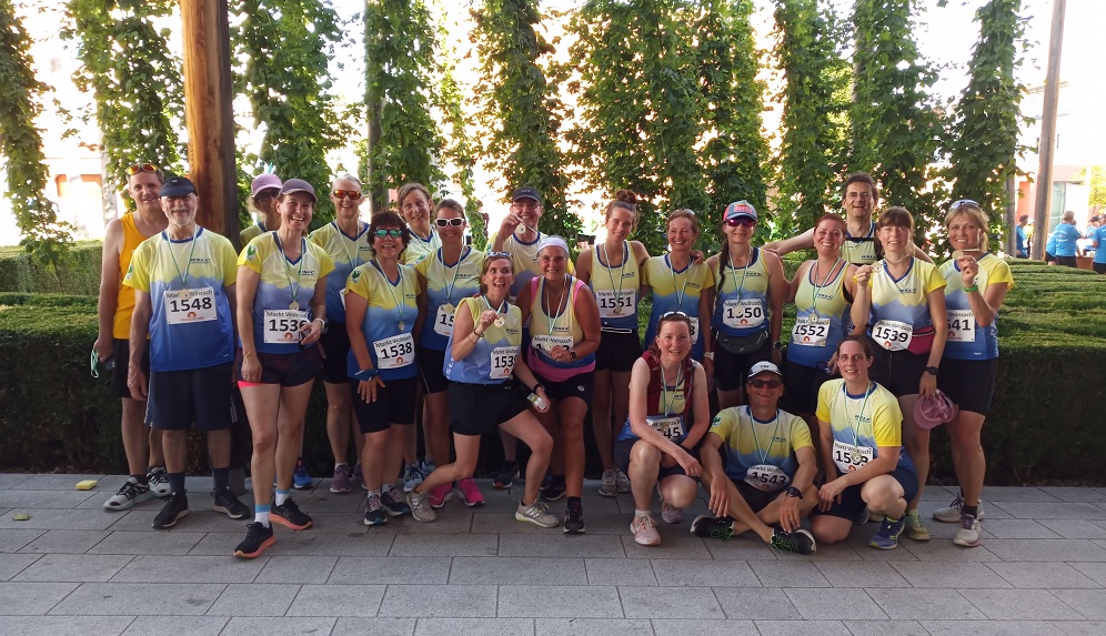 Der RSLC war mit 21 Läufern angereist. Mit mehreren Fahrgemeinschaften ging es um 14:00 in Holzkirchen los. Gegen 15:30 trafen wir in Wolnzach ein und parkten die Autos in der Nähe des Schwimmbads. Nachdem alle umgezogen waren, ging es gemeinsam zum Stadion. Dort fanden wir zum Glück noch ein schattiges Plätzchen, wo wir die Zeit bis zur Startaufstellung verbringen konnten. Außerdem gab es Rasensprenger zur Abkühlung, die auch von einigen ausgiebig genutzt wurden. Ein Aufwärm-Programm brauchten wir diesmal nicht, aber Cora mobilisierte mit uns die Muskeln und Gelenke. In die Startaufstellung ging es diesmal erst kurz vor dem Start. Läufer und Walker wurden ab 17:00 in mehreren Startblöcken auf die Strecke geschickt.