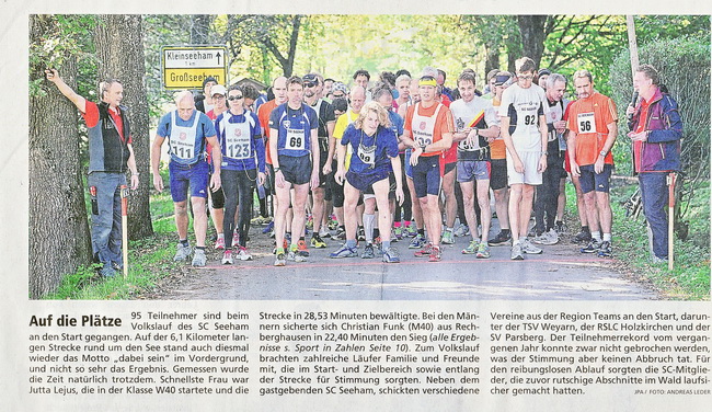 Einen super Tag hatten die Veranstalter des SC Seeham für ihren Lauf um den Seehamer See erwischt. Bei idealen Lauftemperaturen um die 12°C und wunderbarem Sonnenschein machten sich 95 Teilnemher auf die 6,1 Kilometer lange Strecke rund um den See. Schnellster war Christian Funk (Sparda-Team Rechberghausen) Altersklasse M40 in 22:40 Minuten. Knapp eine Minute dahinter lief schon der schnellste RSLCler ins Ziel, Achim Bader, der Gesamtdritter wurde und in seiner Klasse M40 hervorragender Zweiter. Ulrich Möller erreichte in dieser Klasse einen guten 14. Platz. Bei den Damen W20 kam Franziska Deml mit Rang 3 aufs Stockerl. Silke Noak kämpfte sich in der Klasse W40 über die Strecke und landete auf Platz 5. Ingrid Harzer konnte in ihrer Klasse W60 den einzigen Klassensieg für den RSLC erringen.