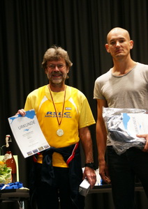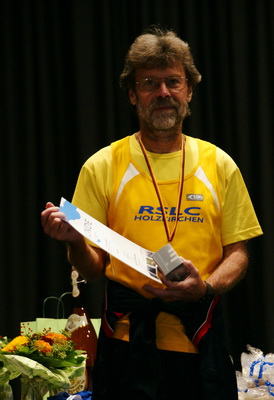 Aber es lief anders. Nach dem Wendepunkt sah er seinen beiden AK55 Mitläufern ins Gesicht und wusste um nur 4 Minuten Vorsprung und seine wohl nachlassende Energie nach so wenig Training seit Anfang August. Da half nur die Flucht nach vorne, zumal er in der 2. Runde meist ohne Sicht zu Mitläufern vor und hinter ihm in Kontakt war. Richtung Kilometer 30 schon mit dem Einbruch rechnend, kam dieser nicht. Statt dessen konnte Rainer seinen Schnitt gut unter 5 Minuten pro Kilometer halten und einige voraus laufende Läufer einholen. Nach Kilometer 38 und einer Steigung begann sein Endspurt, der ihm mit 3:19.11 Stunden den 14. Gesamtplatz bescherte und den klaren AK 55 Sieg - nach nur 1:40 Stunden - für die 2. Runde.