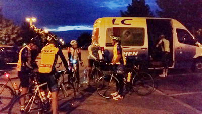 Bei Mori, südlich von Rovereto, wo der Radweg die Etsch verläßt, klappte es schließlich. Die Fahrer hatten nun 320 Kilometer in den Knochen und brauchten nur noch Wasser. Es war mittlerweile halb neun und bedenklich dämmrig. Einige hatten Bedenken wegen einer Weiterfahrt im Dunklen. Aber so kurz vor dem Ziel wollte niemand aufhören. Und so traten sie nun in zwei Gruppen die letzten hundert Höhenmeter hinauf zum Passo San Giovanni. Dann geht es fast nur noch hinunter nach Arco. Um halb zehn und 12 Stunden Fahrtzeit waren die 344 Kilometer (Tacho Stefan) und 1.700 Höhenmeter endlich geschafft.