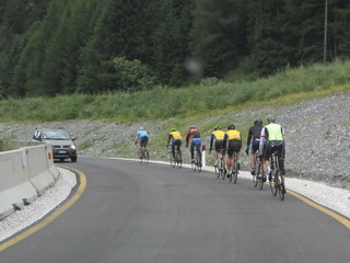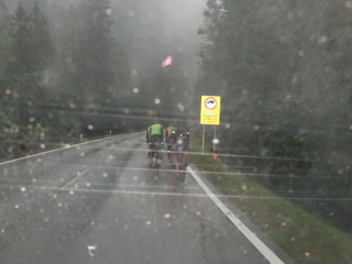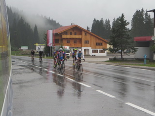 Punkt 5 Uhr startete dann eine Gruppe von sieben Radlern am Industrieparkplatz in Holzkirchen. Die Nacht über hatte es geregnet und die Straßen schön angefeuchtet. Momentan war es etwas trocken. Doch schon hinter Bad Wiessee begann leichter Nieselregen, der ganz sachte immer stärker wurde. Am Achensee waren es nur noch 9°C und unsere Radler froren erbärmlich, vor allem diejenigen, die sich vor allem auf den warmen Süden vorbereitet hatten. Auf der steilen Straße hinunter nach Jenbach zitterten auch die bergerprobtesten Radsportler schon mächtig.
