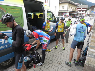 Beim Start vom Brenner war es halb zwölf. Die Fahrt hinunter nach Sterzing war der reinste Genuß. Ab dem Brenner gibt es einen durchgehend ausgeschilderten Radweg das Eissacktal abwärts über Bozen und das Etschtal hinunter bis Rovereto und weiter bis zum Gardasee. Vor Brixen ist die Wegführung etwas winklig und so wählten unsere Radler die Landstraße und überholten kurz vor Franzensfeste sogar wieder den Teambus mit den Betreuern Georg und Margot, da sowohl die Autobahn wegen eines Unfalls als auch die Straße wegen einer aktuellen Brückenbaustelle verstopft waren.