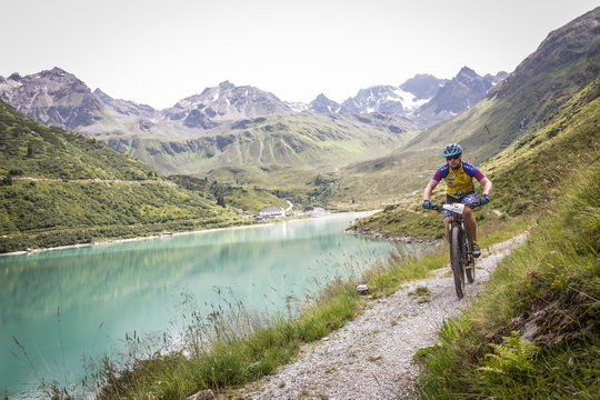 Die Strecke führte zuerst noch recht gemächlich über Asphalt- und Schotterstraßen das Silbertal entlang, bevor es über vier kleinere Gipfel und die anschließende Abfahrt wieder hinunter ins Tal ging. Dort angekommen, wartete auf der gegenüberliegenden Talseite schon der zweite lange Anstieg auf die Teilnehmer. Dieser brachte neben einigen Schweißperlen auch einen Wetterumschwung mit sich. So begann es nach etwa der Hälfte des Rennes kräftig zu regnen. Dies sorgte zwar für eine willkommene Abkühlung jedoch auch deutlich anspruchsvollere Streckenverhältnisse. Daniel kämpfte sich weiter durch und hatte auch für den Schlussanstieg auf die über 2.000 Meter hoch gelegene Bielerhöhe am Silvretta-Stausee noch einige Körner übrig. Von dort ging es dann über einen steilen Singletrail, welcher immer wieder die wunderschöne Silvretta-Hochalpenstraße kreuzte, zurück nach Schruns.