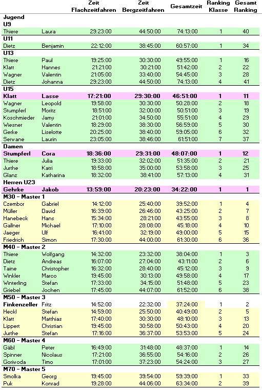 Überlegener Sieger bei den Herren war Jakob Gehrke mit Bestzeiten auf beiden Strecken: Flachzeitfahren 13:59 Minuten und auf die Gindelalm 20:23 Minuten.